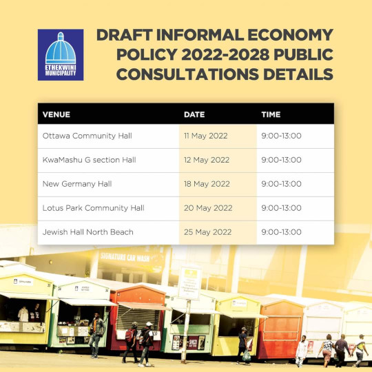 The eThekwini Municipality is conducting a review of its current Informal Economy Policy. A series of regional consultations with informal sector members is underway to ensure their views are documented in the draft 2022-2028 Informal Economy Policy.